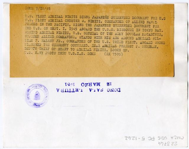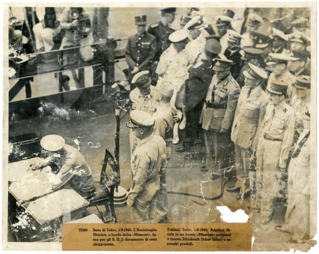 Sulla nave «Missouri», attraccata nella baia di Tokyo, il 01/09/1945, il comandante della Marina americana Chester W. Nimitz firma il documento della resa del Giappone.