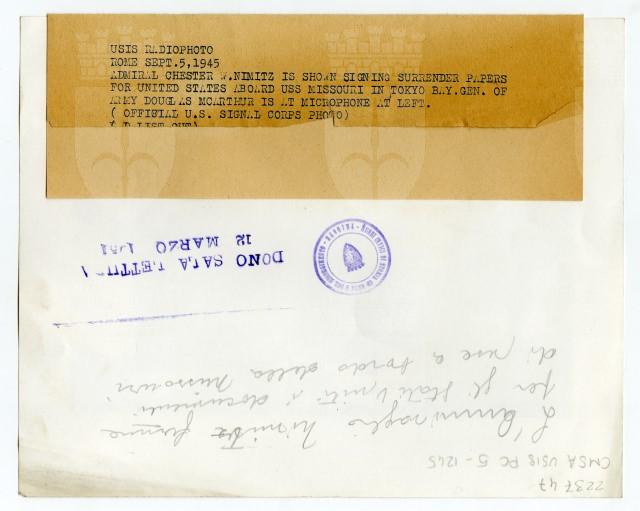 L'Ammiraglio Chester W. Nimitz firma i documenti della resa del Giappone sulla nave Missouri nella Baia di Tokyo, nel settembre del 1945.