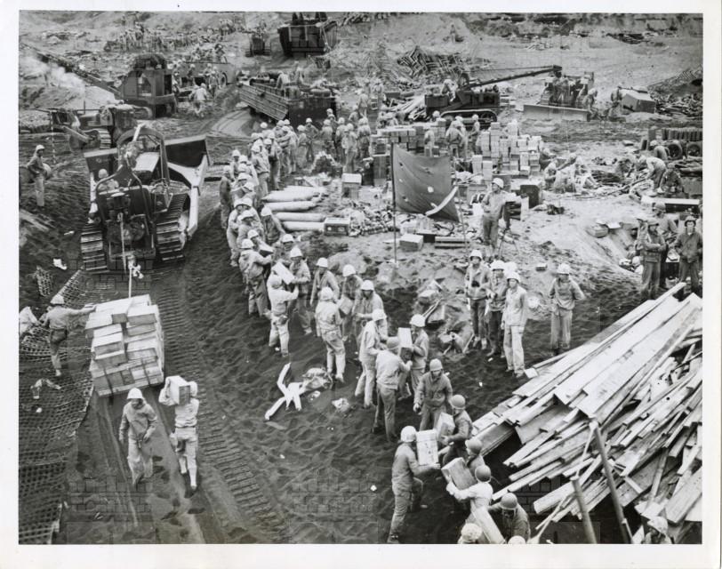 Marinai americani caricano e trasportano provviste durante la battaglia di Iwo Jima.