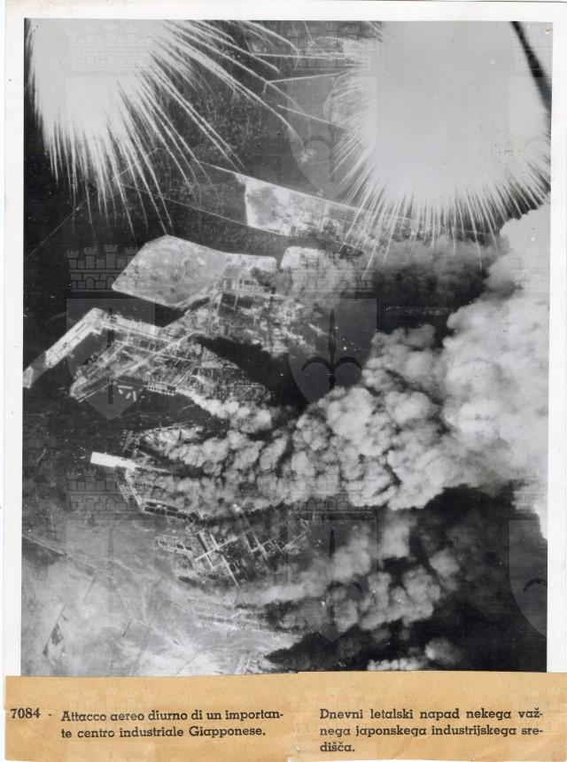 Veduta aerea dell'esplosione, a seguito di un bombardamento americano, di un centro industriale giapponese.