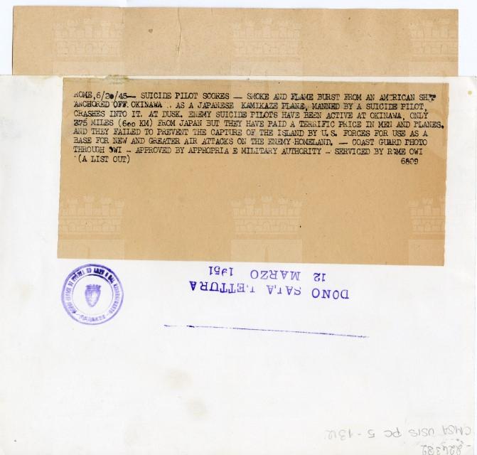 Una nave americana in fiamme dopo un attacco suicida da parte di un aereo giapponese nelle acque di Okinawa.