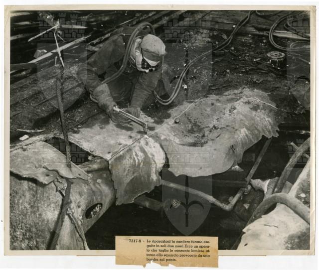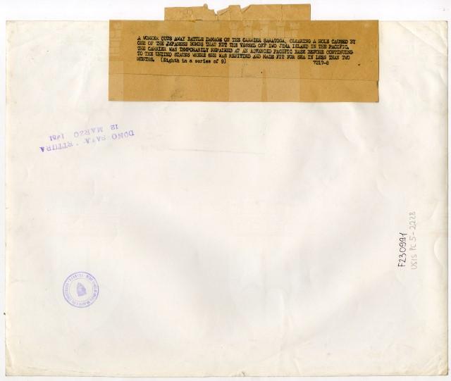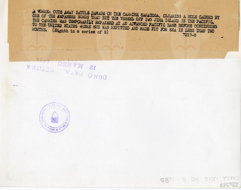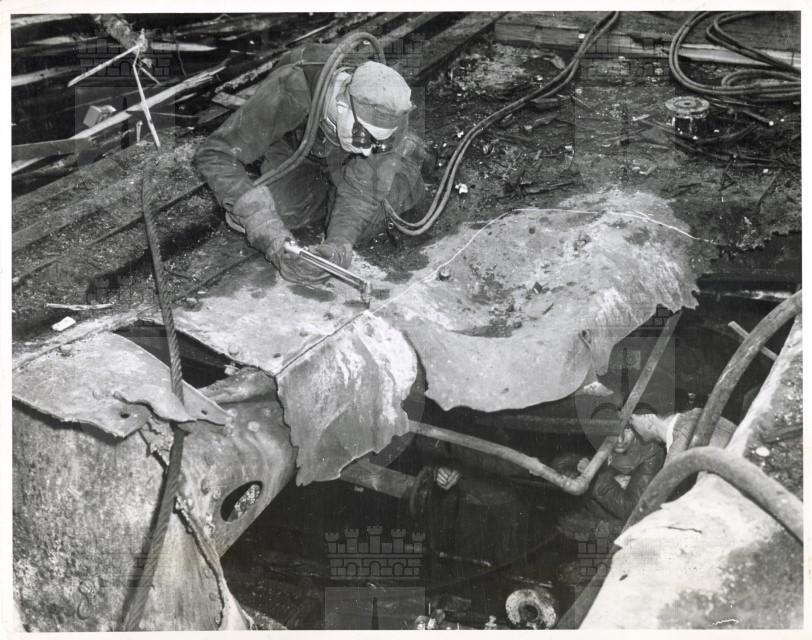A worker cuts away battle damage on the carrier Saratoga