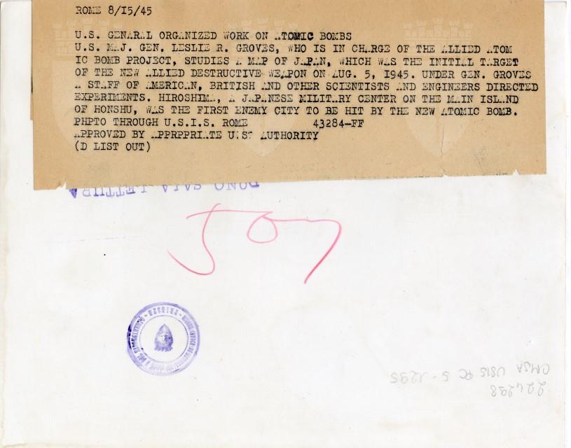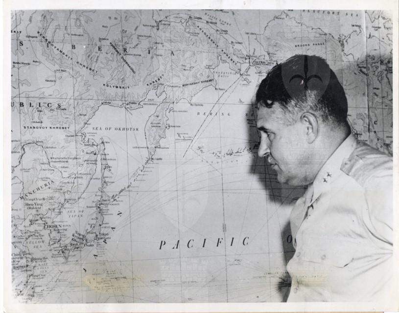 Il Generale Leslie R. Groves studia una carta geografica dell'Asia durante i preparativi per il lancio della bomba atomica.