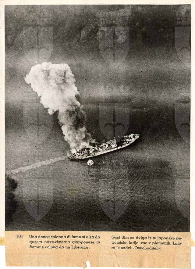 Veduta aerea di una nave giapponese in fiamme a seguito di un bombardamento da parte dell'Aviazione britannica