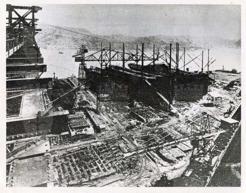 Veduta dall'alto di un cantiere navale giapponese nell'area di Nagasaki, obiettivo militare americano.