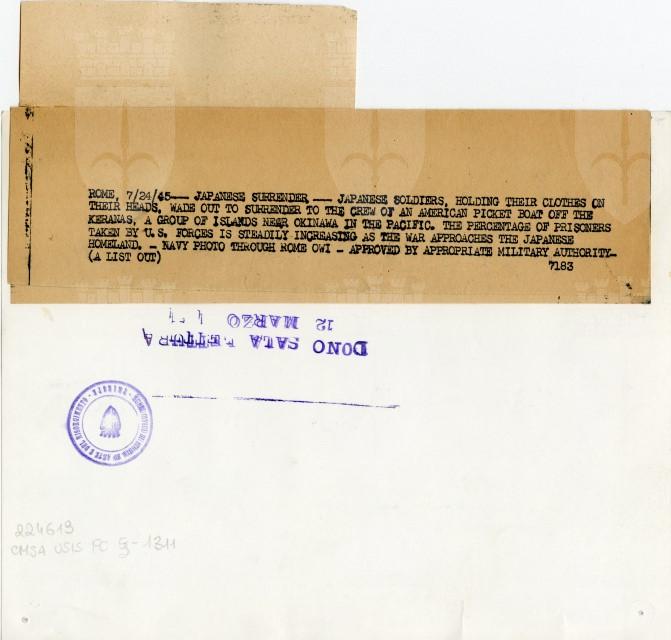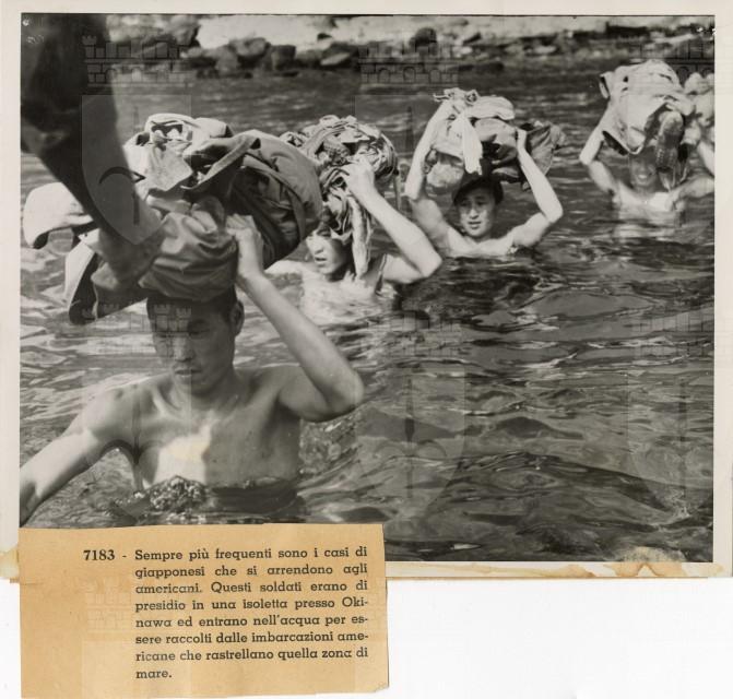 Alcuni militari giapponesi si arrendono agli americani: vengono raccolti dalle navi nelle acque di Okinawa.
