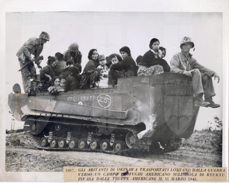 Marinai americani trasportano alcune donne e bambini di Okinawa verso un campo profughi americano lontano dalla guerra.
