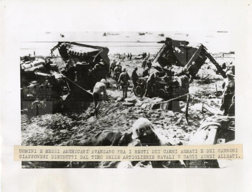 HomeUomini e mezzi americani avanzano fra i resti dei carri armati e dei cannoni giapponesi distrutti dal tiro delle artiglierie navali e dagli aerei alleati