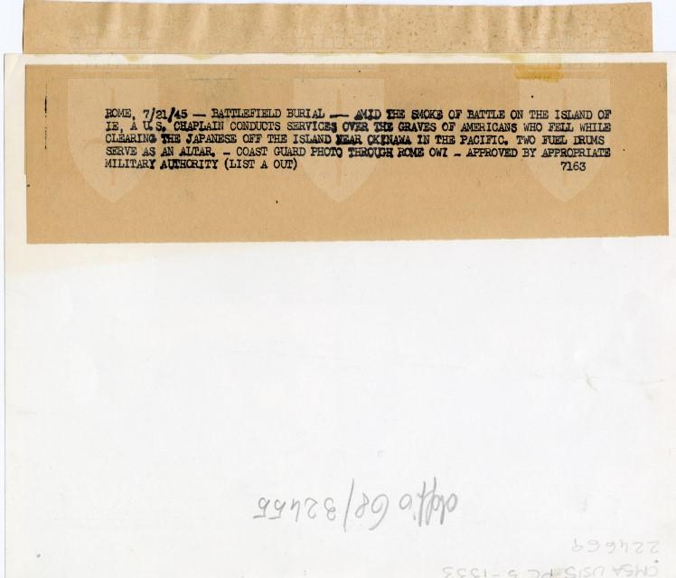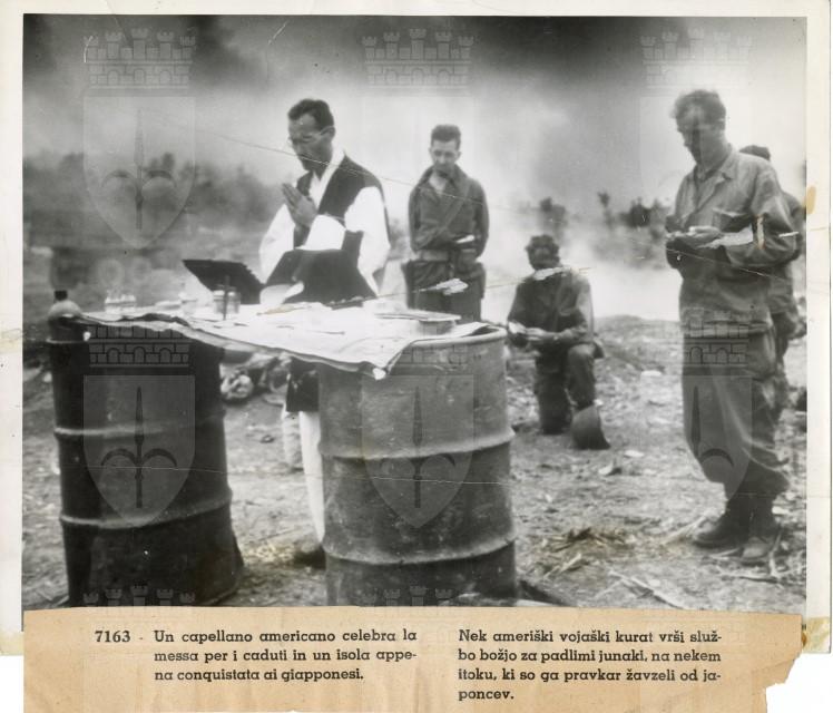 Un cappellano americano celebra una messa in onore dei caduti in un campo di battaglia di Okinawa.