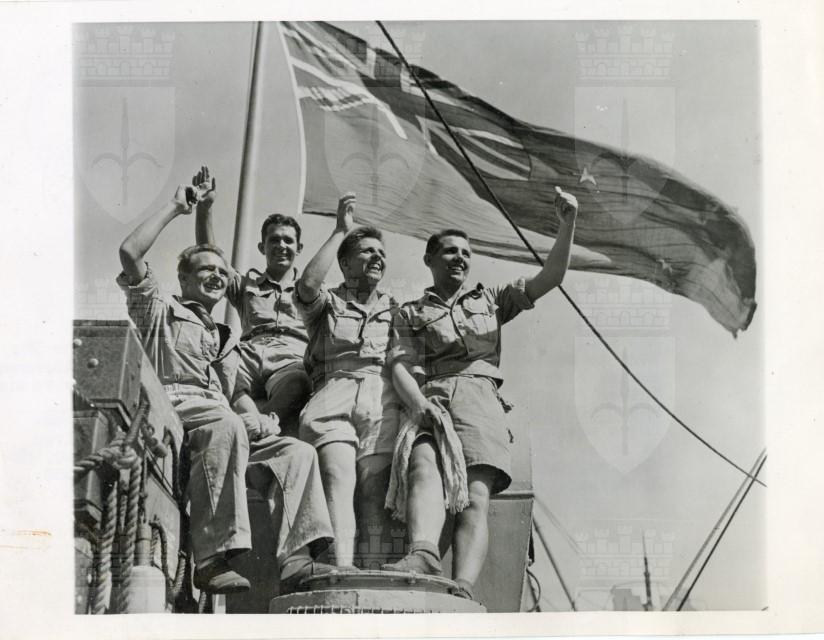 Quattro soldati inglesi, fatti prigionieri in Giappone, si trovano su una nave nel Porto di Suez che li riporterà in Gran Bretagna.