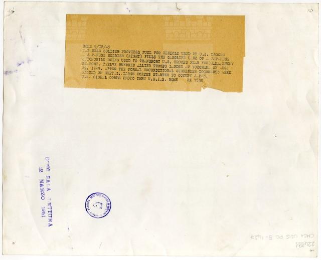 Un soldato giapponese riempie il serbatoio di un'automobile, che servirà al trasporto delle truppe americane.
