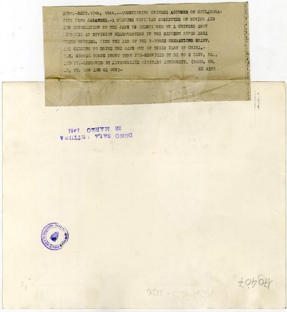 Questioning Chinese accused of collaborating with Japanese. A Chinese civilian suspected of giving aid and information to the Japs is questioned by a Chinese army colonel at divisin headquarters in the Salwee river area (...)