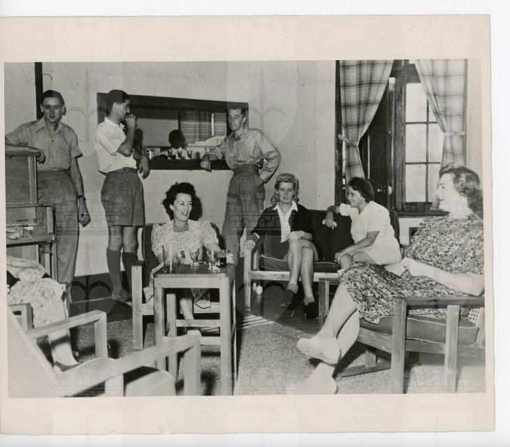 Una folla felice di donne appartenenti alla W.A.A.F ( Women Auxiliary Air Force) si riuniscono per un drink nel bar dell'ostello a Little England.
