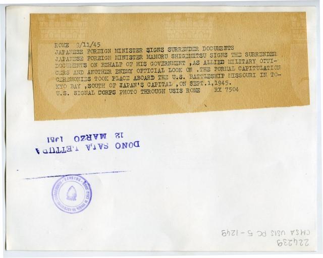 Il Ministro degli Affari Esteri giapponese Mamoru Shigemitsu firma i documenti di resa del Giappone nel settembre 1945.