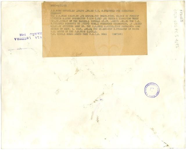 La delegazione giapponese, guidata dal Ministro degli Affari Esteri Mamoru Shigemitsu e dal Generale Yoshijirō si trova sul ponte della nave americana Missouri per firmare la resa del Paese nel settembre 1945.
