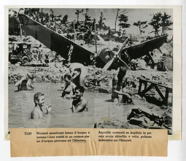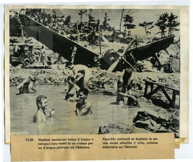 Marinai americani fanno il bagno nel cratere di una bomba pieno d'acqua piovana sull'isola di Okinawa.
