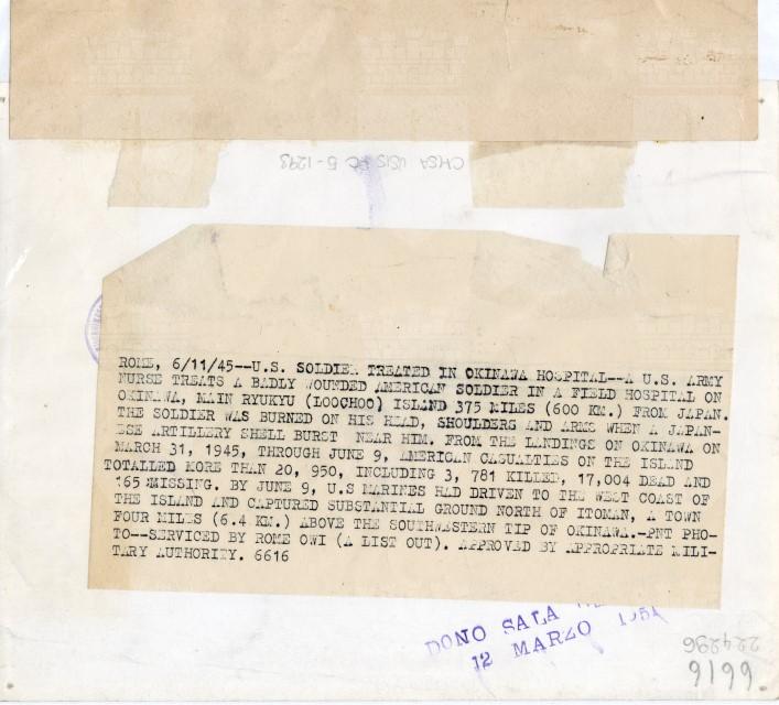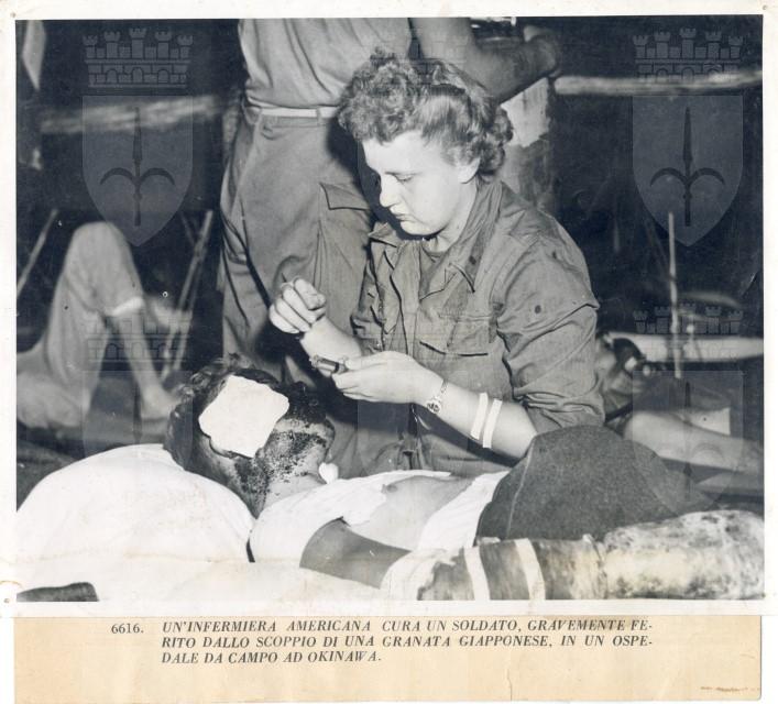 Un'infermiera cura un soldato americano ferito al volto dallo scoppio di una granata giapponese sull'isola di Okinawa