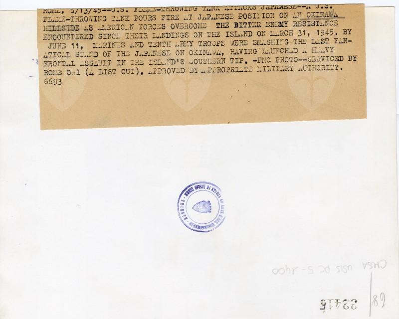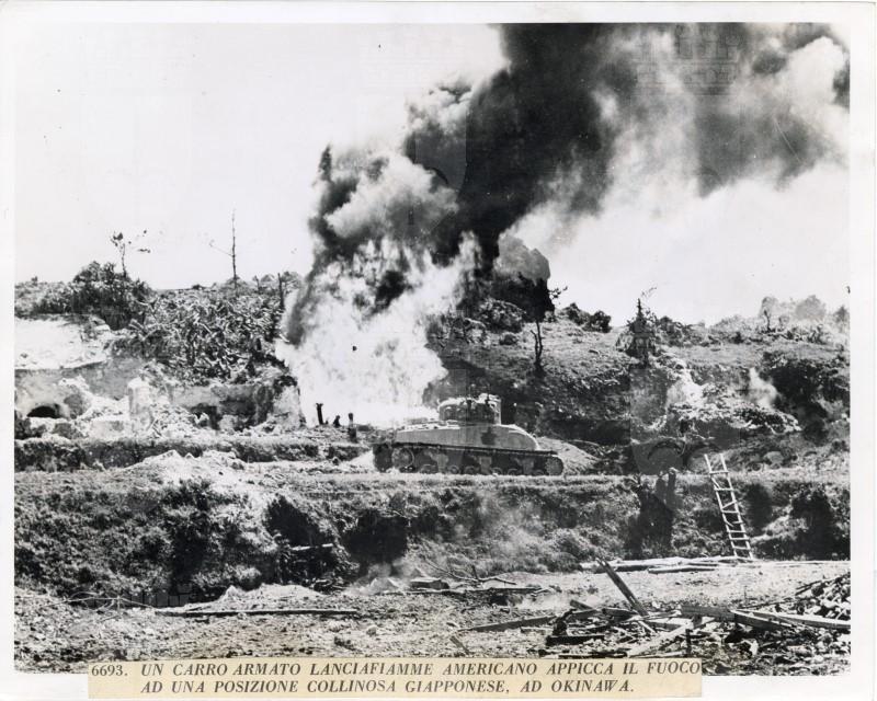Un carro armato lanciafiamme americano attacca una posizione giapponese sull'isola di Okinawa.