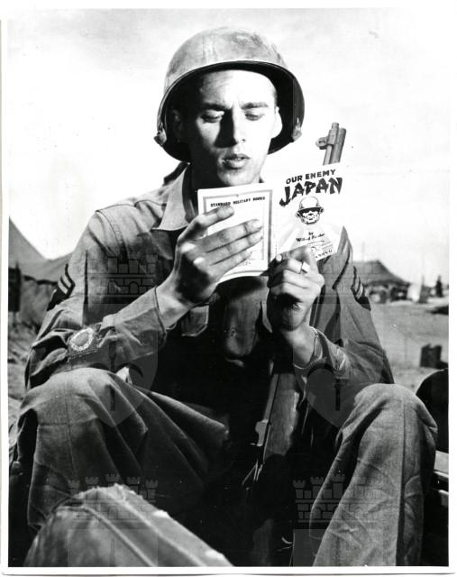 Joseph Melosh in posa mentre legge "Our enemy Japan" di Wilfried Fleisher.