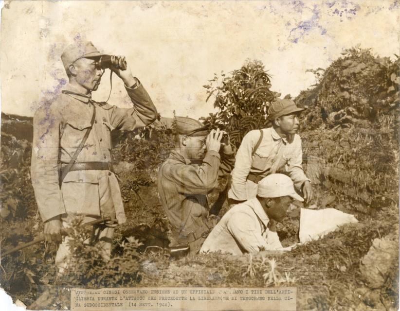 U.S. and chinese officer observe artillery fire in battle for Tengchung