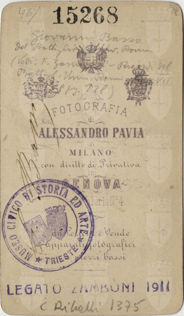 Giovanni Basso (Nizza, 1824-Genova 1884), esule con Garibaldi nel 1834, partecipa alla campagna militare del 1859 nei Cacciatori delle Alpi. Vive a lungo a Caprera ed è segretario di Garibaldi. Combatte nella battaglia del Volturno, nel 1860. Volontario nel 1866, fu insignito della medaglia d'argento al valor militare. Segue ancora il generale nella spedizione dell'Agro romano nel 1867 e ne facilita la fuga a Caprera dopo l'arresto di Sinalunga.