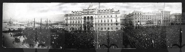 Straordinaria immagine, ottenuta unendo 3 fotografie, della piazza Unità di Trieste gremita di folla il 20 marzo 1921, quando si proclama solennemente l'annessione della Venezia Giulia all'Italia. Il re Vittorio Emanuele, impossibilitato a venire, manda un fervido saluto augurale. Si vedono le R.R. navi Duilio e Vittorio Emanuele.
