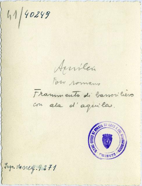 Frammento lapideo decorato rinvenuto nel foro di Aquileia. Il pezzo mostra una parte di un'ala di aquila sopra la quale corre un nastro ondulato.