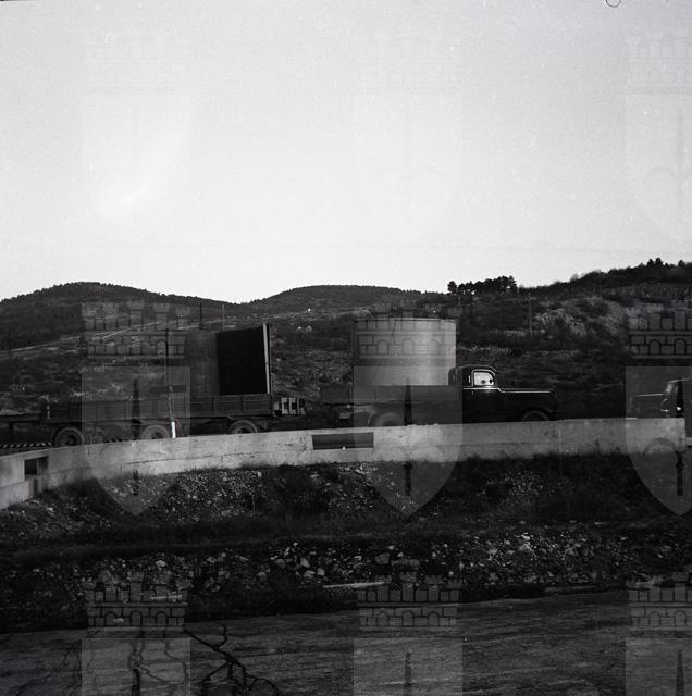 Tre camion rimorchio, giunti da Crema, trasportano un grande serbatoio destinato alla Raffineria Aquila. Il vuoto e' composto da un primo elemento lungo m 7,5 e del diametro di m 3,80, peso circa 20 tonnellate, e da un altro elemento analogo e della struttura metallica del forno. E' il primo impianto del genere costruito in Italia, su disegno di una ditta di Boston