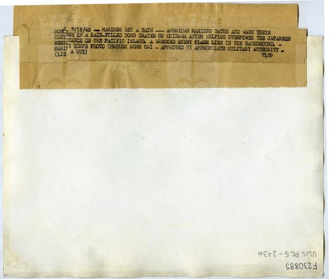 Marinai americani fanno il bagno nel cratere di una bomba pieno d'acqua piovana sull'isola di Okinawa.