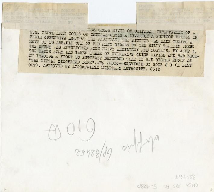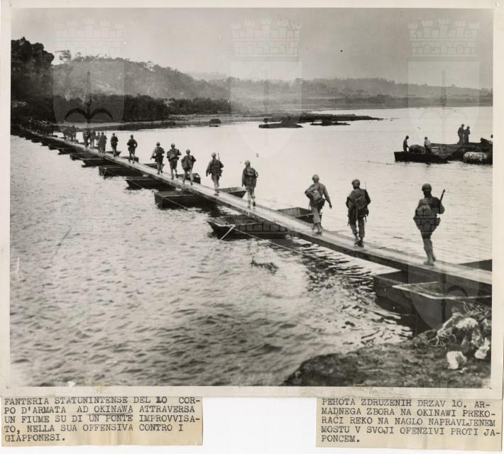 La fanteria statunitense attraversa un fiume su un ponte costruito con delle barche e continua la sua offensiva contro i giapponesi sull'isola di Okinawa.