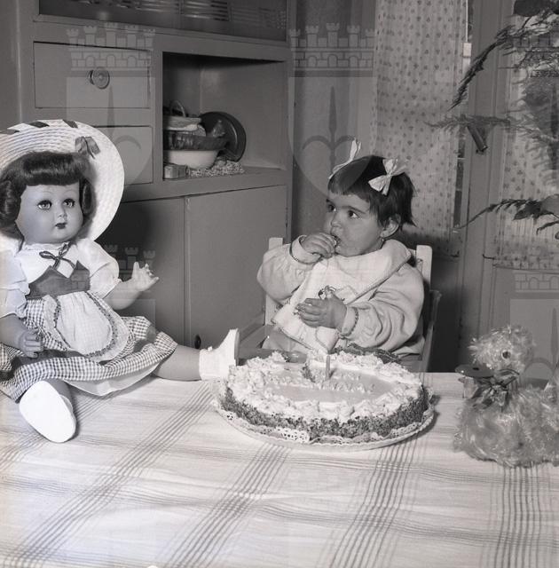 La bambina, che compie un anno, è seduta sul seggiolone: ha due fiocchetti sui capelli e porta gli orecchini.Sul tavolo sono disposti da sinistra a destra: una bambola, la torta con la candelina e un'anatra di peluche.