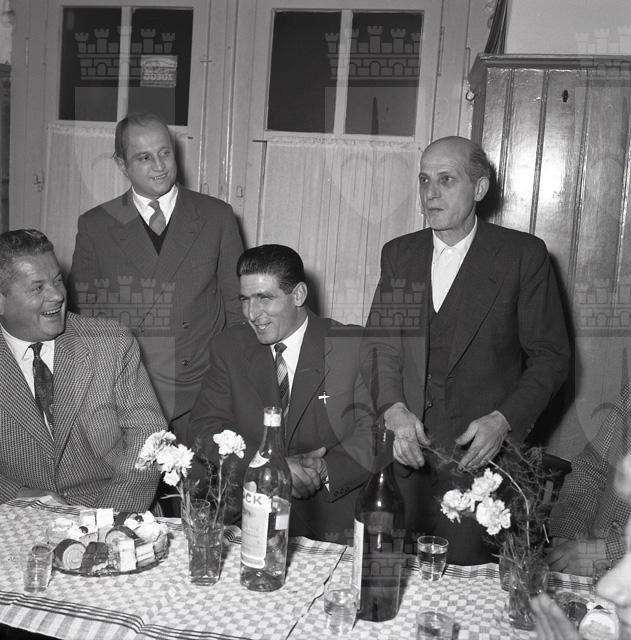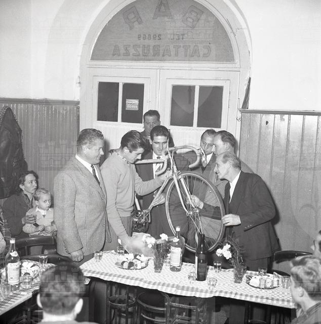 Guido De Santi consegna all'allievo Eligio Pelizon della Società Ciclistica Gino Bartali di Trieste la bicicletta donata dal campione di cui la società porta il nome al miglior atleta sociale della stagione. Il dono ha un particolare valore morale perché si tratta della bicicletta sulla quale Bartali corse il Tour de France 1949. Testo tratto da Il Piccolo Sera: Le ultime notizie del 22.11.1955.