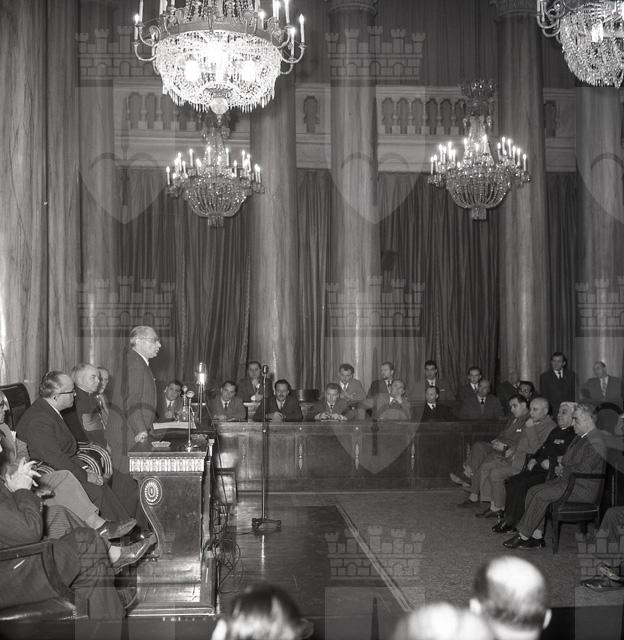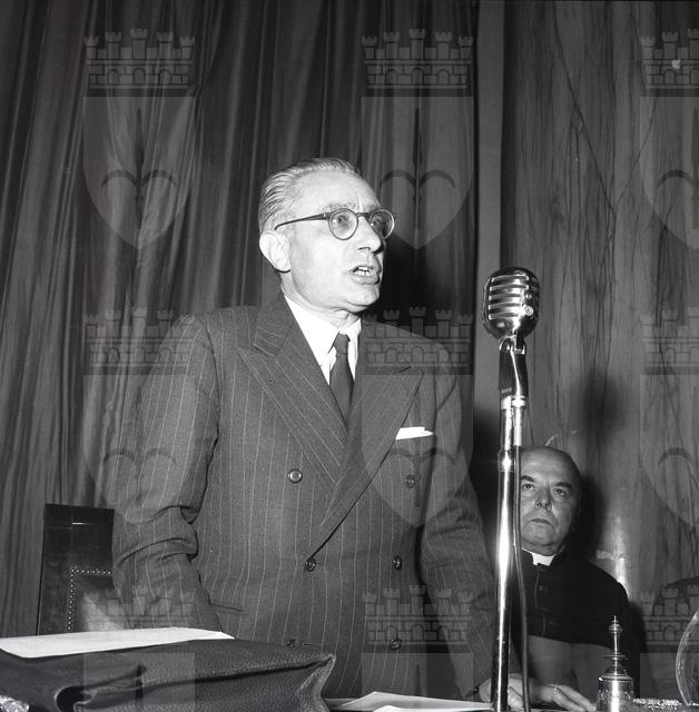 Il sottosegretario al Tesoro, Antonio Maxia (4/3/1904 - 15/4/1962), nella sala maggiore della Camera di commercio, insedia la commissione per i danni di guerra. Borsatti, erroneamente, lo definisce ministro