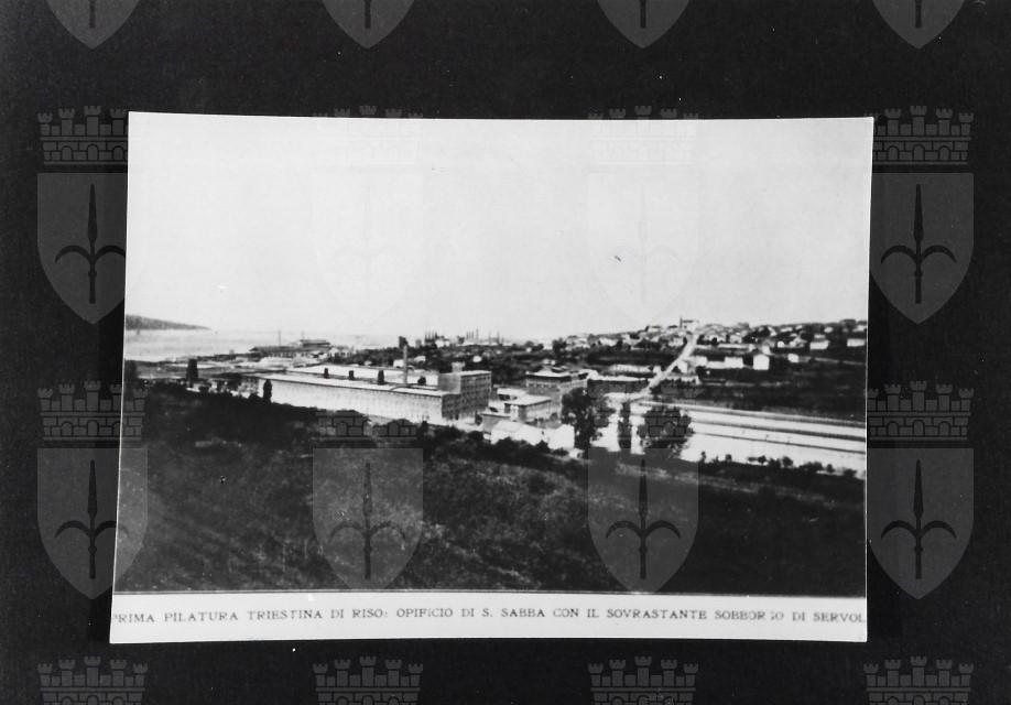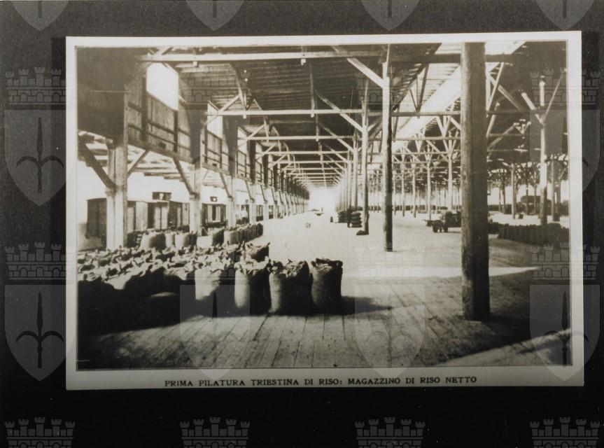 Riproduzione fotografica degli edifici della pilatura del riso, dei magazzini