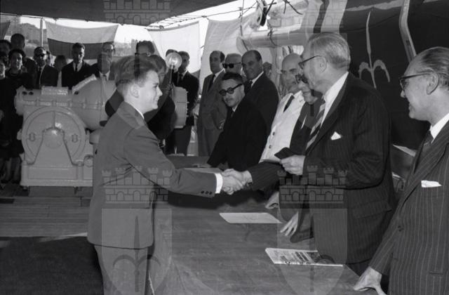 A bordo della motonave Europa, il presidente del Lloyd Triestino, amm. Capponi, consegna le borse di studio assegnate dalla Società.