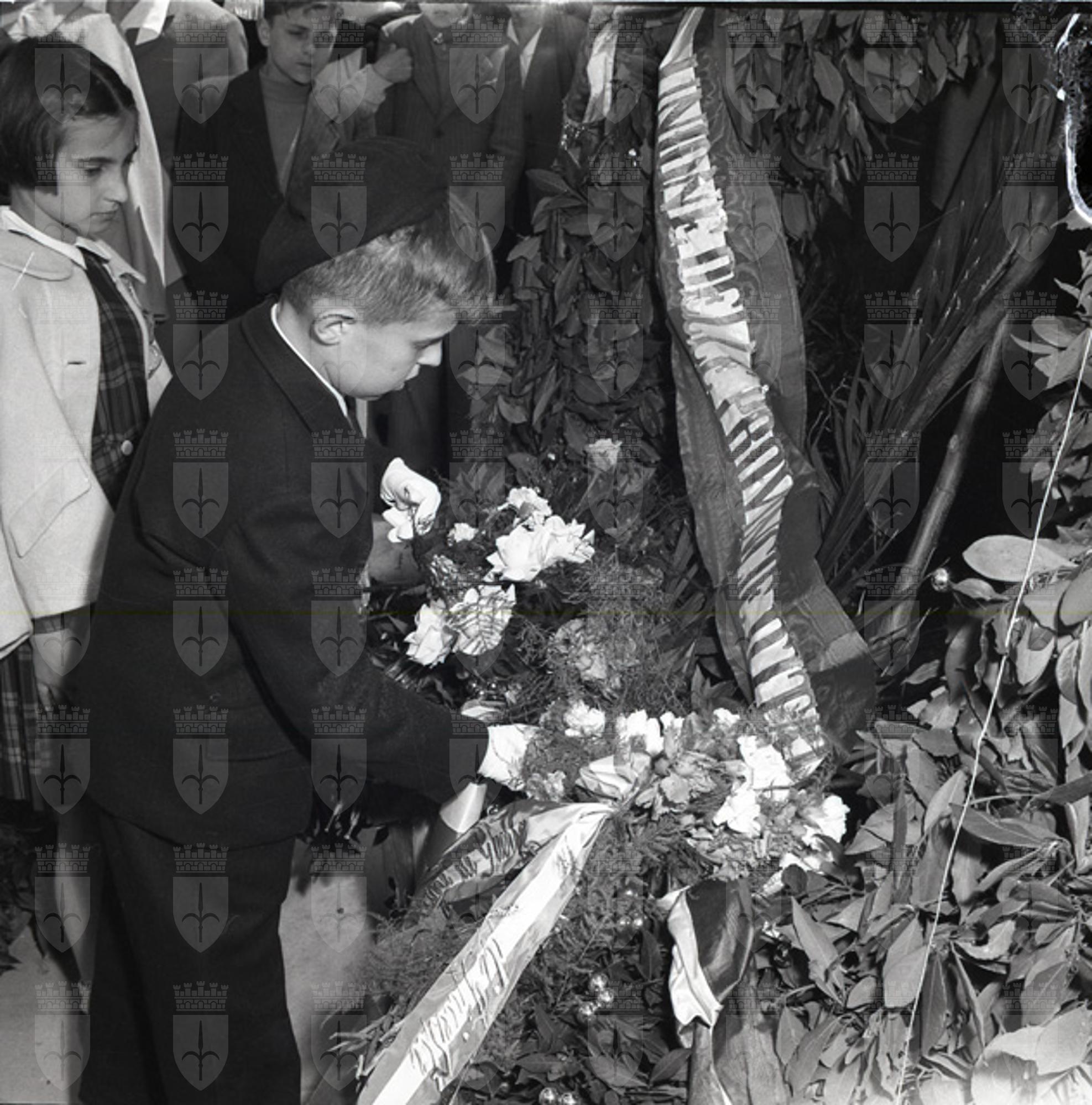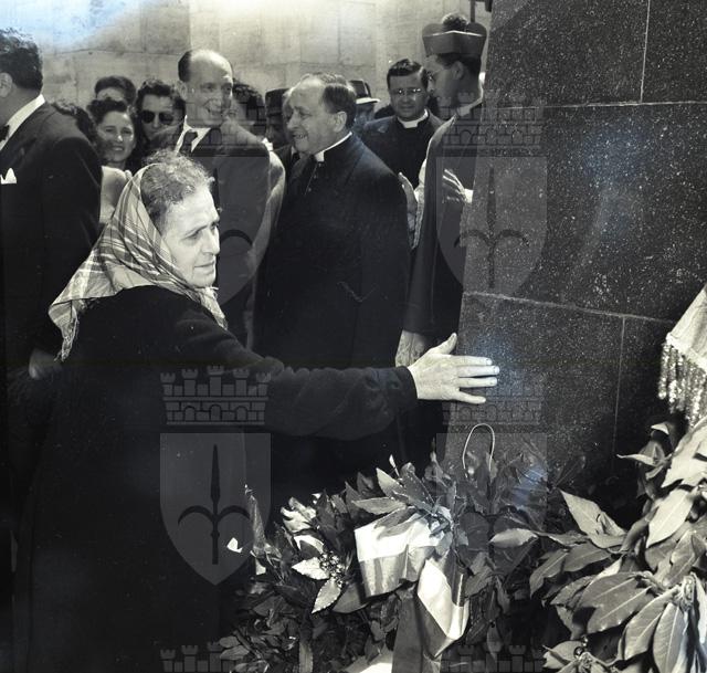 Folla presenzia alla cerimonia di inaugurazione dell'Ara Pacis Mundi di Medea. Cartellone sul muro di una casa: Sottocentro fecondazione artificiale. Uomo al volante di un'automobile