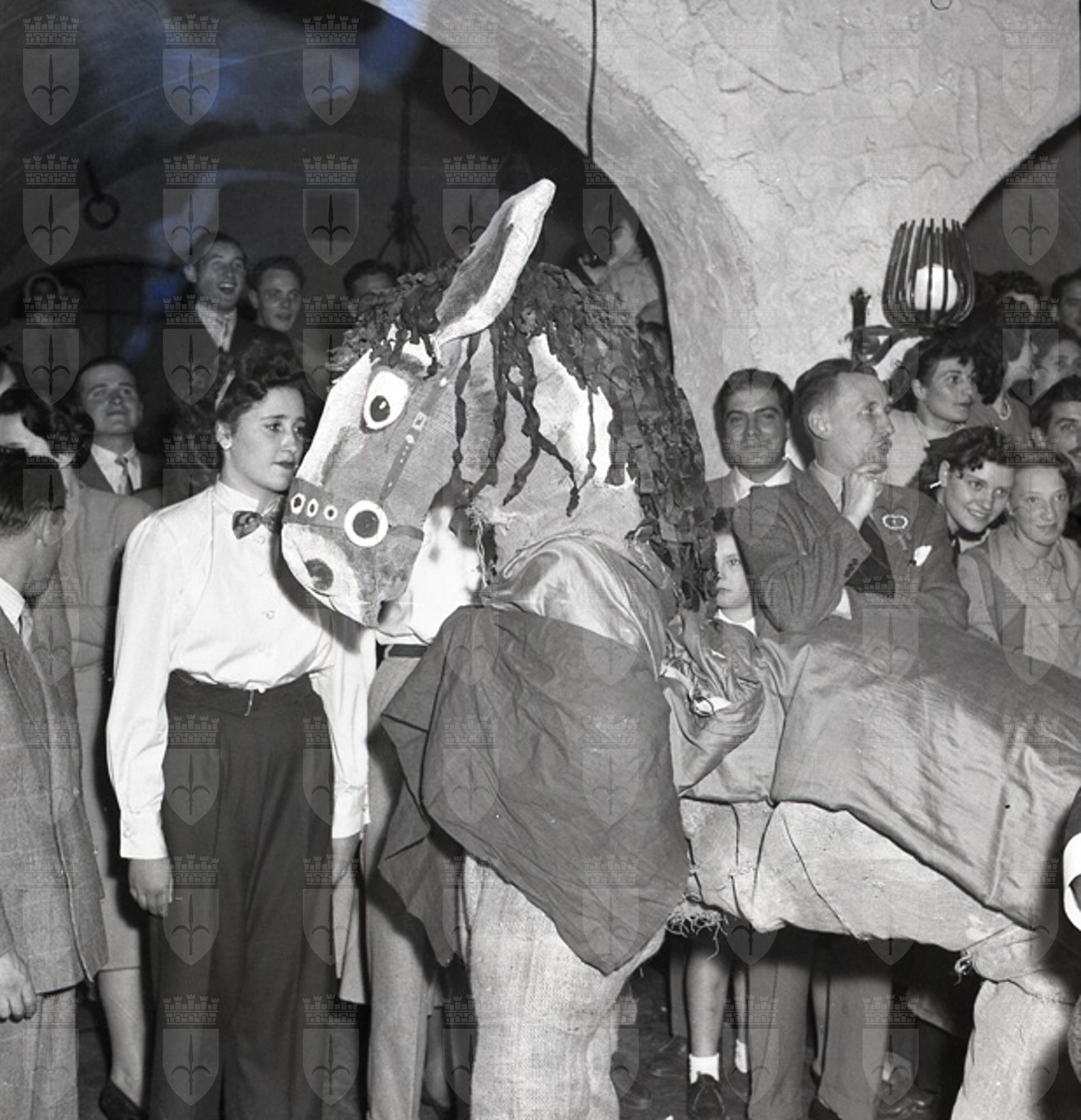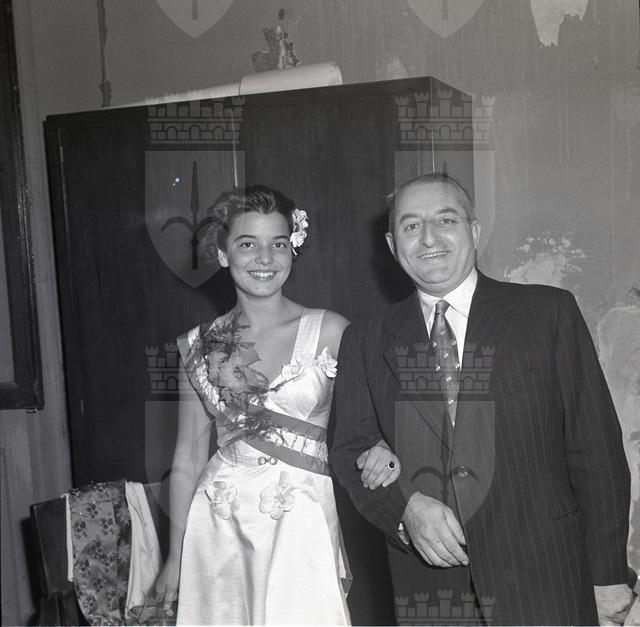 Sfilata di carri allegorici per le vie del centro; Ketty Burba, Miss Trieste 1951, in posa accanto ai grappoli; festa al castello di San Giusto.