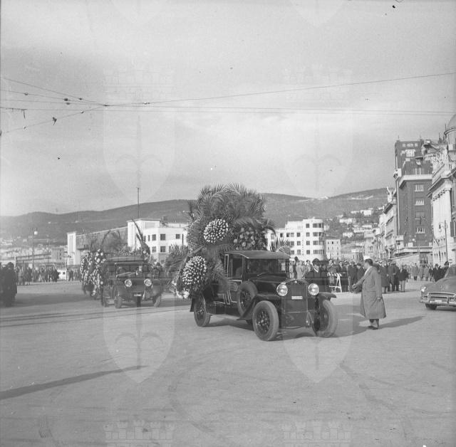 La salma del barone procede, accompagnata dalla folla, dall'ospedale Burlo-Garofolo per le vie della citta, fino alla chiesa greco ortodossa di San Nicolo per la celebrazione delle esequie.