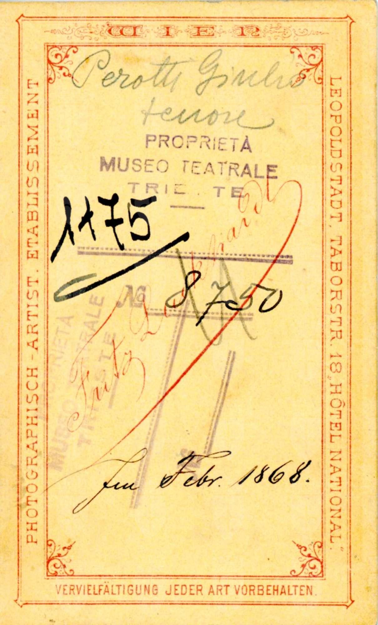In costume. Alias Julius Prott, tenore, si è esibito in molte città d'Europa e d'America. Nel 1874 ha cantato al teatro Mauroner di Trieste nel "Trovatore". Appassionato di giardinaggio, alla fine della sua carriera si è stabilito a Trieste dove ha aperto un'azienda per la coltura delle rose riconosciuta a livello internazionale; si può anche ricordare lo storico negozio di fiori in Capo di Piazza.