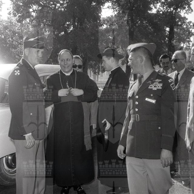 Il generale John A. Dabney consegna al vescovo Santin le chiavi della chiesetta di Banne. Il piccolo tempio, appartenuto a un patrizio triestino, è stato interamente ricostruito dal Genio americano (Giornalfoto, 17.10.1954)