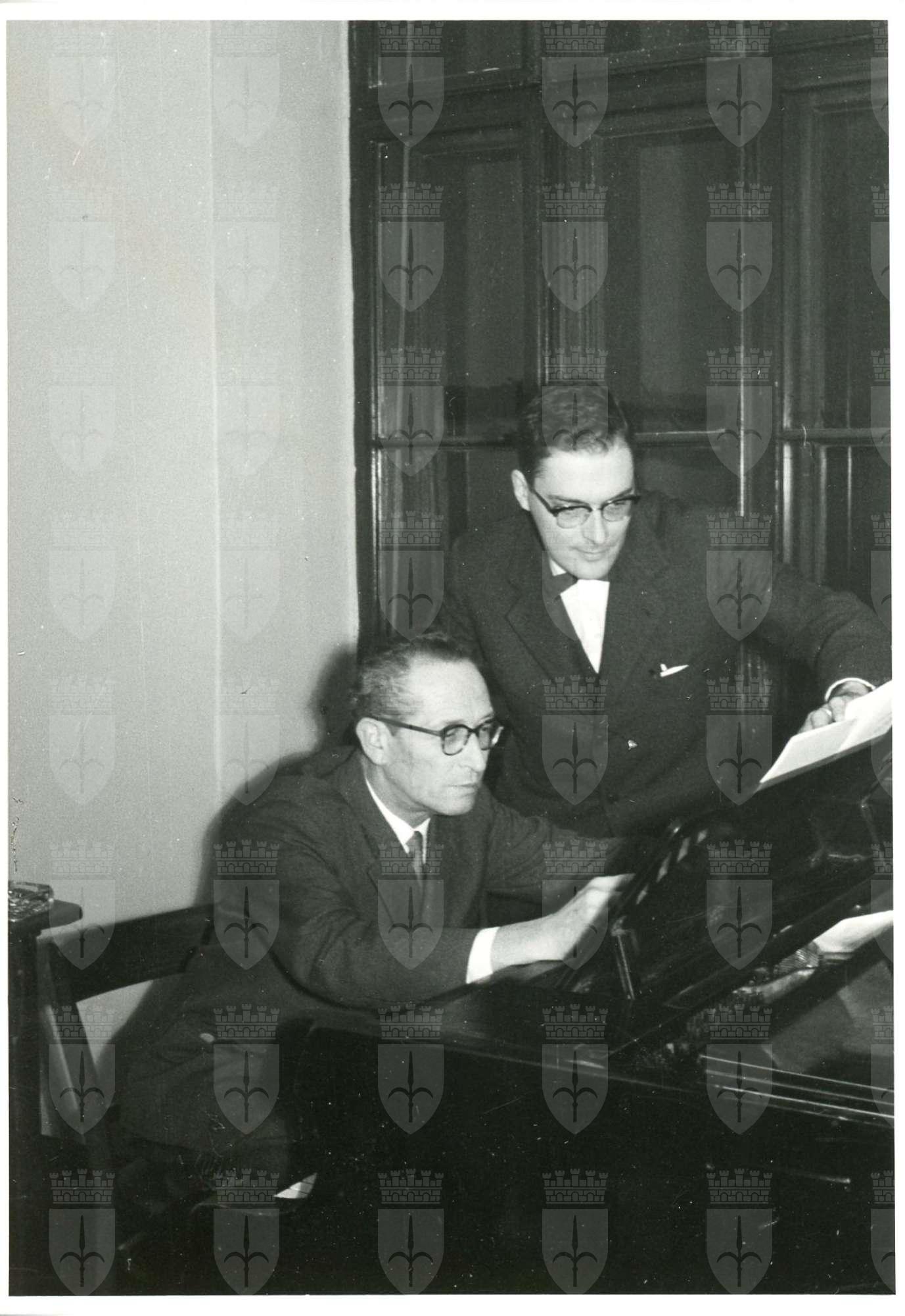 Pavle Merkù con il direttore d'orchestra croato Mučić in occasione dell'esecuzione di Ex Alcuini Carmini