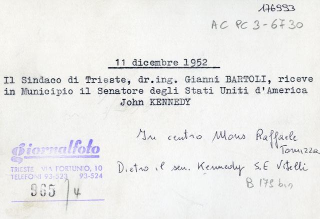 11 dicembre 1952 ; Il Sindaco di Trieste, dr ing. Gianni Bartoli, riceve in Municipio il senatore degli Stati Uniti d'America John KENNEDY