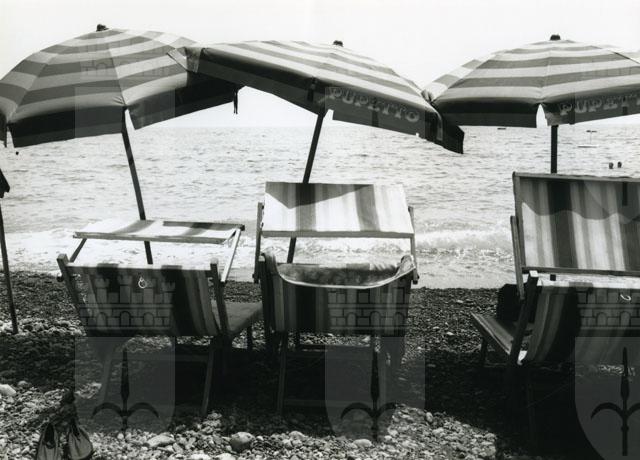 Veduta del mare con ombrelloni e sdraio