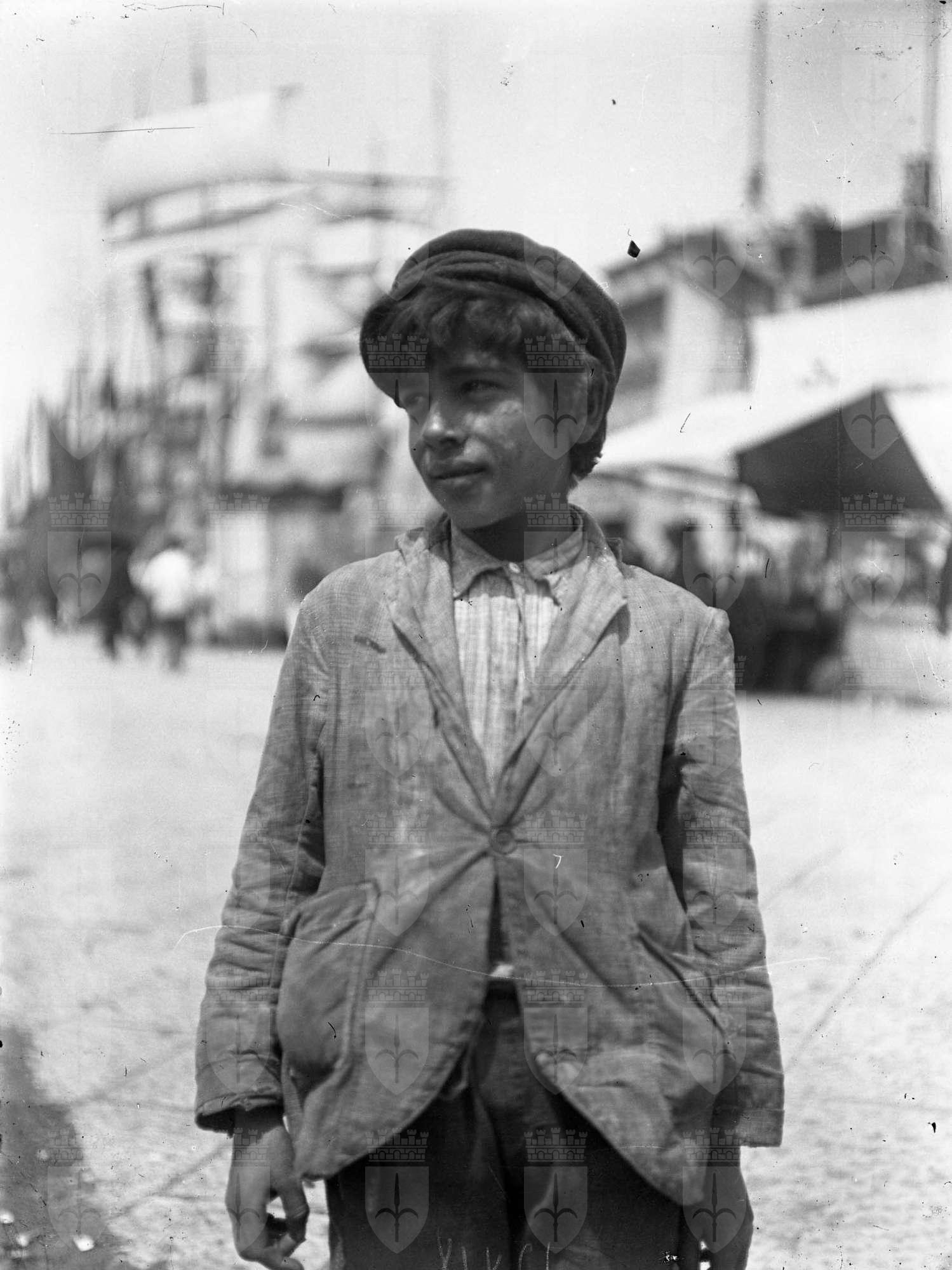Il ragazzo ritratto di tre quarti indossa una giacca e un cappello logori.