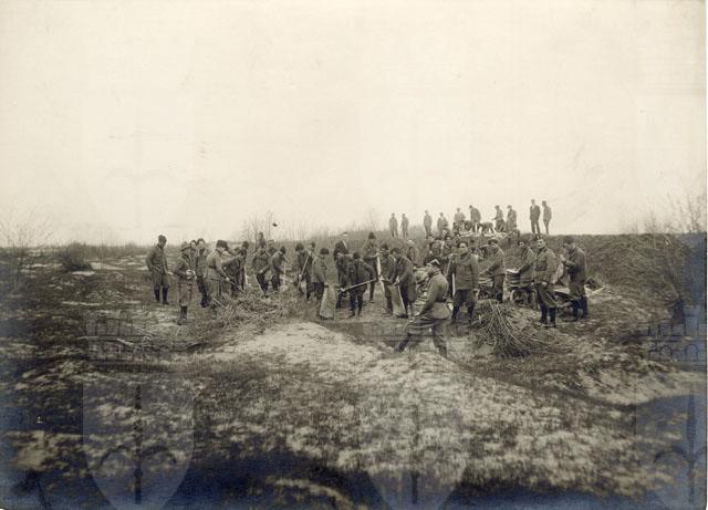 Fascisti ripresi mentre si addestrano ad arginare con la sabbia l'eventuale straripamento del fiume Isonzo