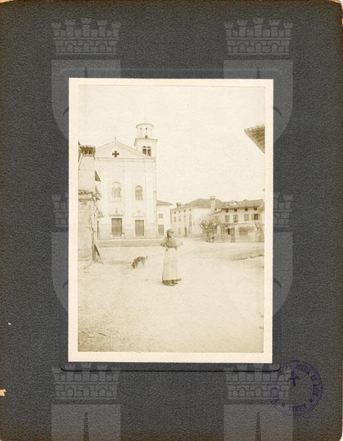 In primo piano, una contadina con grembiule e fazzoletto in testa, sullo sfondo un cane e altre due donne intente a conversare.