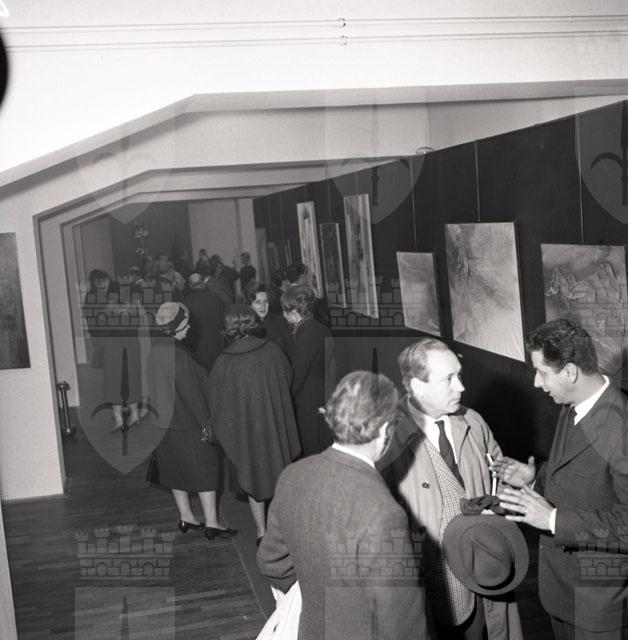 Presso la Galleria del Teatro Nuovo ha luogo la rassegna di undici artisti della Nuova Scuola Europea organizzata a Trieste con la collaborazione delle gallerie Kasper di Losanna e Il Canale di Venezia. Si tratta di un'esposizione ricca di spunti polemici. I pittori e scultori, per lo più d'età inferiore ai quarant'anni ch vi partecipano, affermano di battersi "contro ogni forma di provincialismo" per realizzare l'unità europea anche nel settore artistico. Con il belga Haccaria sono presenti alla mostra gli spagnoli Argimon, Tabara e Vallès, gli italiani Barisani, Bonalumi e Marti, i parigini Ducman e Kerg e gli svizzeri Madin e Rehmann. Testo tratto da "Nuova scuola europea" in "Il Piccolo. Le ultime notizie, 28.11.1961 p. 2. Il giornale pubblica una foto di Adriano de Rota che coglie un anziano Cesare Sofianopulo che si abbassa ad analizzare il piedistallo di una statua.