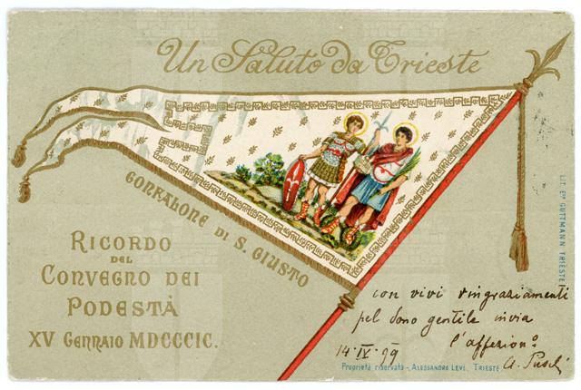 Cartolina commemorativa del convegno dei podestà raffigurante il Gonfalone di San Giusto