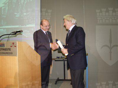 Il sindaco Roberto Dipiazza consegna il sigillo trecentesco al professor Umberto Senin, al tavolo della presidenza siedono l'assessore regionale alla sanità Gianni Pecol Cominotto e il professor Luciano Campanacci presidente dell'Associazione Medica Triestina