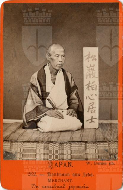 Mercante giapponese seduto su una stuoia con vicino un testo a ideogrammi